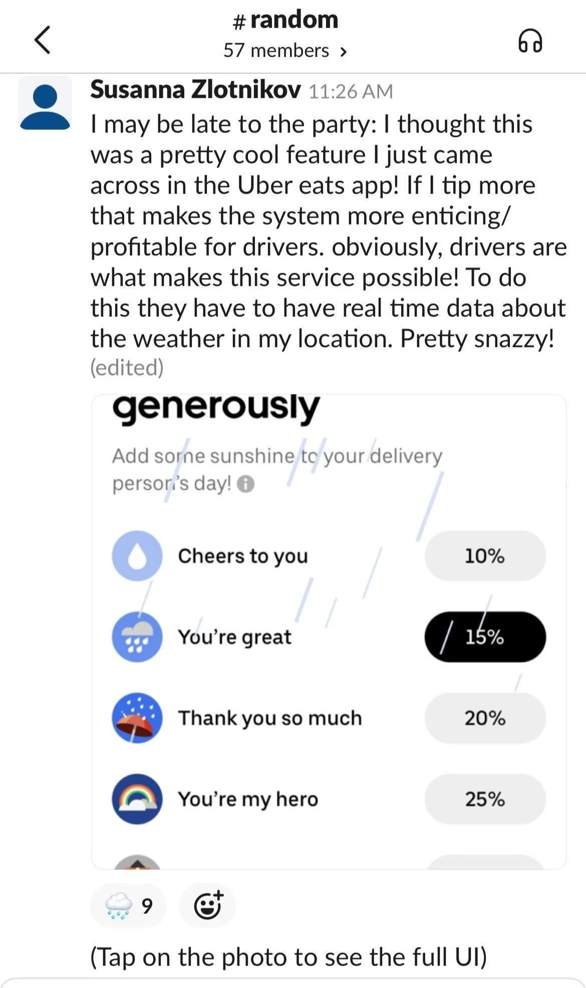 Sneaking in teaching moments is oddly rewarding. Real life examples like tipping on the Uber Eats app are really helpful in making course content feel immediately relevant. I love being able to share these examples informally through channels like Slack to help students become keen observers as well!